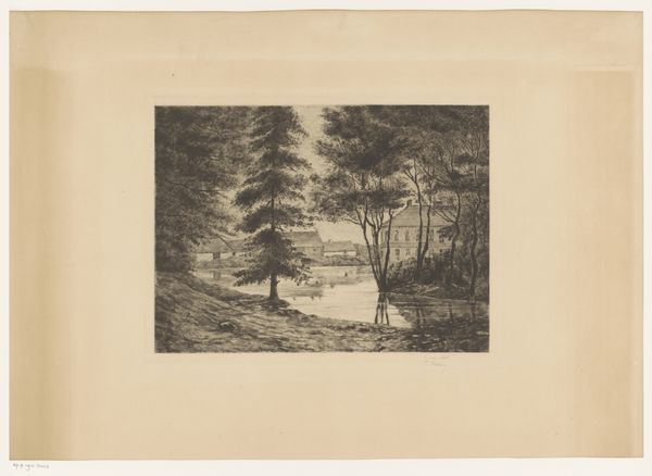 Editor: Here we have Thorvald Niss’s “Winter watercourse by a forest,” an engraving print created sometime between 1842 and 1905. The subdued grayscale gives it a stark, almost bleak feeling. I'm intrigued by how such a simple scene can evoke such a strong emotional response. What stands out to you in terms of its composition and technique? Curator: Formally, the piece is dominated by a carefully calibrated distribution of light and shadow. The engraver's tools have been used to create a remarkable range of tones, from the almost stark white of the snow to the deep blacks of the treeline. Note how the lines create texture and depth; how do you feel the arrangement of elements directs your eyes? Editor: I see how the stream kind of leads my eye into the darker thicket in the back. It's interesting that you focus on the abstract shapes of the tones. How does this abstraction add to the engraving? Curator: Abstraction, here, is a means of distilling the essence of the landscape. By focusing on the formal elements, the artist is drawing attention to the intrinsic qualities of the scene, the relationship between line, shape, tone, and texture rather than aiming to just replicate its physical appearance. Have you observed the variations in lines used in this print? Editor: Yes, the varying thicknesses in the lines seem to define depth and shadow. Also, I like how this print focuses less on grand emotions or stories and more on quiet contemplation of the landscape. Curator: Precisely. It exemplifies how the formalist approach illuminates the aesthetic and structural decisions shaping a work. These structural devices determine the artistic effect that informs the print and our observation of it. Editor: It definitely helps to focus on the visual language of the art itself, beyond any historical interpretations. Thank you! Curator: The beauty lies within this type of visual breakdown. It lets us decode an engraving like Niss' using core art concepts.