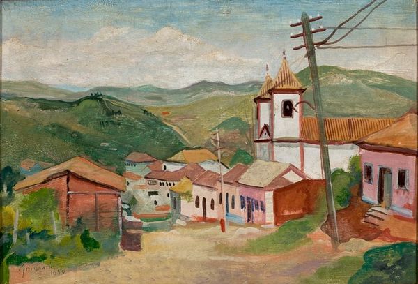 Alberto da Veiga Guignard painted this dreamlike landscape, Paisagem De Ouro Preto, with oil on canvas, using delicate washes of color. The palette feels muted, like a memory, or perhaps a place seen through fog. There's a real sense of the artist feeling his way through the image, a kind of tender searching. I'm really drawn to the way Guignard handles the paint. It's thin, almost translucent in places, allowing the texture of the canvas to peek through. The buildings and rooftops feel solid, but the hills in the background are more atmospheric, created with soft, blended brushstrokes. Look at the road in the foreground, the way he captures the light hitting the surface, creating a sense of depth and movement with just a few simple strokes. It’s a masterclass in restraint, in knowing when to stop. Thinking about other artists, this reminds me a little of Giorgio Morandi, with its quiet, contemplative mood. But Guignard brings his own unique sensibility to the work, a sense of wonder and maybe even a bit of melancholy. It invites you to slow down, to really look, and to find beauty in the everyday.