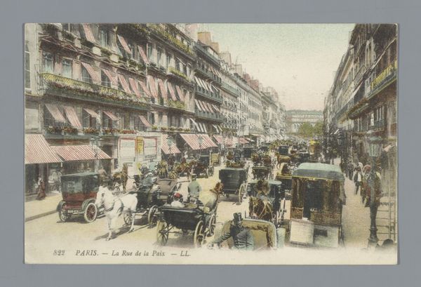 Editor: Here we have "Paris. - Le Boulevard Saint-Martin," a 1908 photographic print by Léon & Lévy. The soft, almost hazy quality of the print gives it a dreamlike feel. It's so busy! I wonder, what visual stories do you find most compelling in this snapshot of Parisian life? Curator: It's more than just a street scene, isn't it? Note how the Arc de Triomphe anchors the composition. Arches, symbolically, have always represented transitions, triumphs, entries into new phases. Considering this was captured just before a World War, does this bustling boulevard depict the apex of La Belle Époque or perhaps a subconscious collective drive through it? Editor: That's an interesting read! I was stuck on it being just an elegant historical scene. But transition makes so much sense now. How does the use of light play into this? Curator: Ah, light is always the key to understanding the emotion in a scene, right? Notice how the light, subtly diffused, bathes everything. There's no harsh shadow, only a gentle illumination. It hints at a shared hope, a unified public identity perhaps. Think about it, streetlamps, the arc, the light reflected on those buildings – they serve to create a kind of symbolic illumination. What does light mean to you in the composition? Editor: Thinking about light as collective hope is very helpful. I see now how everything--even the carriages and the dress of the figures—contributes to a narrative. Curator: Indeed. Each element tells a fragment of the story. Together, they construct something of our cultural memory. A moment framed on film that continues to echo meaning. Editor: I hadn't considered the enduring nature of such a scene, a captured moment reverberating into the future. Thank you for that new perspective! Curator: It's in understanding the subtle symbolic dialogue between objects and settings that a moment is brought to life, again and again. It remains that, isn’t it?