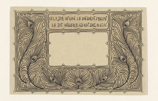 Editor: This graphic art piece, "Decoratief kader met de spreuk 'bitter in den mond maakt het hart gezond,'" or "Decorative frame with the saying 'bitter in the mouth makes the heart healthy'," created by Reinier Willem Petrus de Vries sometime between 1884 and 1952, is really striking in its simplicity. The color palette is muted, and there's something almost architectural about the layout. What do you see in it? Curator: Well, immediately, I see a rather clever visual representation of a proverb. That grid structure, to me, evokes both precision and constraint – a structured approach to something that feels inherently paradoxical. It's also undeniably Art Nouveau, don't you think? Editor: Yes, the geometric design definitely suggests Art Nouveau influences, although maybe a more restrained version. Is the 'bitterness' then related to such restraint? Curator: Possibly, but let’s probe deeper. The choice of typography feels so deliberate. Look at the firm lettering! Consider also, "bitter in the mouth makes the heart healthy"—it's a rather didactic little proverb. Now, consider, does art itself sometimes present us with uncomfortable truths? Editor: So, maybe the 'bitterness' is not restraint, but perhaps… unpleasant truth. The frame then reminds the viewer that they may need such truths? Curator: Exactly! It suggests that a healthy, full life needs some 'bitterness' to contrast with sweetness. Reinier seems to use design here as a philosophical reminder – food for thought, cleverly packaged. So, did it give you a slightly different impression, now? Editor: Absolutely, I now see it as a reminder of some kind. It’s clever how a decorative piece can carry such a thought. Thank you! Curator: My pleasure. Remember to keep tasting both bitter and sweet in the vast menu of art, for a healthy aesthetic heart.