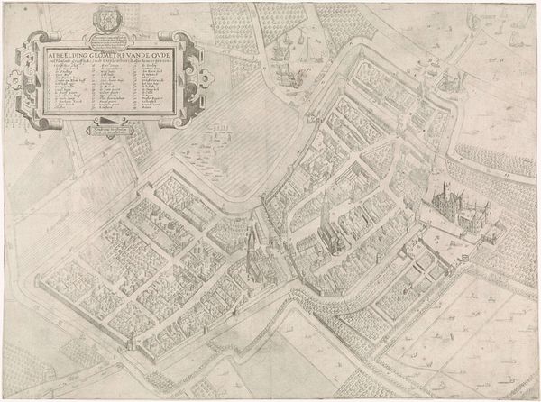 Curator: Here we have Jan van Vianen's "Plattegrond van Utrecht," an engraving dating roughly between 1695 and 1751, housed right here at the Rijksmuseum. It's quite detailed, wouldn't you say? Editor: My goodness, look at the density! The composition feels incredibly dense, almost claustrophobic. It’s hard to believe people actually lived in such tight quarters. How large would you say it is? Curator: It’s impressive, isn't it? This kind of precision engraving required skill, you can appreciate the labor that went into etching all the individual buildings and streets. Notice the technique here— the use of line to represent both physical structures and symbolic power. Editor: Yes, there is some power dynamics here. I wonder how this map affected the social space of the city. Did the production and circulation of these maps play a role in establishing, controlling, or even resisting authority? Who commissioned this piece? Who was the intended audience? Curator: This was likely a project for wealthy merchants or civic leaders wanting to project their authority through representations of the urban landscape. Maps like these demonstrated control over resources and trade routes. Editor: True, the city depicted as an asset. What is absent from this representation? Were lower economic populations included in this type of cartography? This is a powerful display of space in which those who commissioned the art participate. Curator: Perhaps focusing on the elites. Also the tools used, and the printmaking process were very different compared to today. We tend to lose sight of the sheer physicality of creation now that so much is digitized. Editor: Thinking about the city, too, and how it’s changed since. It’s almost nostalgic looking at it this way. You begin to consider questions around urban planning, what was kept and what was lost with time. Curator: Exactly, a material object that spurs conversation across time. That really highlights the purpose of examining the creation of the city's plan during that time. Editor: Yes! So, while the physical engraving captures one moment, our analysis adds layers of contemporary dialogues, bringing the past into our present. Curator: An object can offer so many rich ways of thinking through time and space!