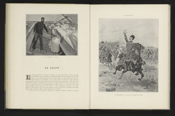 Editor: So this is a reproduction of "Young Woman on Horseback" by Aimé Morot, predating 1901, and appears to be a print taken from a photograph or engraving. I'm immediately struck by the dynamism in the horse’s pose; it’s so full of potential energy. What compositional elements jump out to you? Curator: Indeed, the subject certainly animates the surface of the print. I am compelled by the artist’s attention to tonal gradations. Consider how Morot contrasts the deeper blacks of the rider's habit with the varied greys defining the musculature of the horse. Note also the composition: observe how the verticality of the slender trees guide the viewer's eye towards the seated rider, drawing us further into the tableau. Editor: The positioning of the horse in contrast to the darkness of the surrounding forest creates quite a strong visual interest. Does the number on the horse hold any semiotic significance, or is it simply a visual element? Curator: An astute observation. The number acts as an index; that is, an indicator of something beyond the visual. The integration of the number creates tension, compelling us to ask what event this piece is memorializing. It is this exact sense of mystery that creates a successful work, don't you agree? Editor: Absolutely! It is fascinating how analyzing the visual elements opens up so many avenues of interpretations. It shifts the focus from mere representation to questioning the artwork's underlying implications and intentions. Curator: Precisely! Focusing on these structural elements facilitates engagement beyond conventional assumptions about subject matter or historical background, illuminating the very artifice of art. A fruitful analysis, I must say.