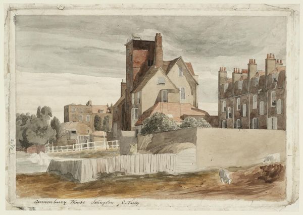 Curator: This delicate rendering of "Gezicht op het Kasteel Culemborg, 1728," housed here at the Rijksmuseum, presents us with a puzzle of provenance; it's attributed to an anonymous hand sometime after the depicted year. The scene unfolds in pen, ink, and subtle washes of watercolor on paper. Editor: My first impression is… nostalgic. It's bathed in this beautiful sepia tone that gives it such an aged and warm character, but it also strikes me as a bit haunting, almost as if Culemborg Castle is fading away like a memory. Curator: Indeed, there’s a ghostly quality to the light, isn't there? What's remarkable is the implied labor. Consider the creation process of producing ink or the availability of paper for meticulous work. How would an anonymous artisan acquire the means and skills for such art? The subtle washes would require precision— mixing ratios, paper treatments… Editor: Exactly, it prompts so many questions! Was this commission work? Personal fascination? You know, looking at it, I find a sort of… hopeful melancholy. There’s the implication of passing time, yes, but the presence of people suggests life persisting around this monumental architecture. Curator: It makes you think about the social fabric surrounding its creation, doesn't it? I wonder about the lives, like that anonymous artist, tied to this specific place. What would the availability of certain dyes or styles of paper dictate about their environment and social connections? Even seemingly subtle compositional choices, such as placement and scale, reflect an active network of making and production. Editor: Well, regardless of the unanswered questions, the artist succeeded in capturing the weight of history— of place. There's a tangible beauty here. It makes you long to walk along that riverbank, even in sepia tones. Curator: Precisely. It reminds us that even the most seemingly straightforward images carry layers of process, intent, and an unyielding legacy of labor that transcends anonymity and offers whispers into worlds bygone.
