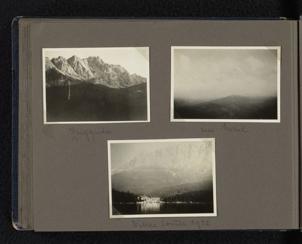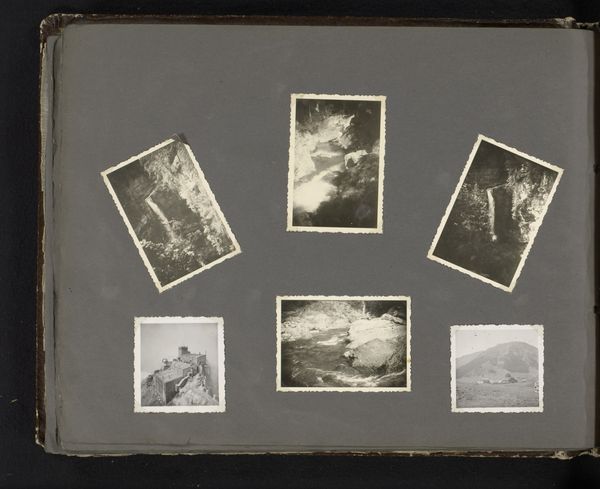 Editor: This is "Berglandschappen," or "Mountain Landscapes," made sometime between 1941 and 1945 by an anonymous artist. It seems to be a collection of snapshots, small black and white photos mounted on a gray background. They all feature mountain views, and some include figures. There’s a melancholic feel to the muted tones. What sort of stories do these images evoke for you? Curator: Immediately, I think of memory, and how fragile it can be. Black and white photography has this incredible power to transform moments into relics, these almost dreamlike, ghostly vestiges. Note how the mountain, often a symbol of permanence and immovability, is rendered in grayscale, softening its edges. Editor: Right, the monochrome definitely emphasizes a certain distance. Do the figures change how you view the mountain as a symbol? Curator: They do indeed. Human presence is a loaded symbol, dwarfed by the landscapes yet actively engaging with it. This makes me think about human impact, the tension between fleeting existence and enduring land. There's almost a melancholic recognition of our relative insignificance. Do you see this reflected in the images themselves? Editor: Definitely, the composition often places the figures off-center, as if the mountain is the true subject. Curator: Precisely. The artist captures these ephemeral moments, framing humanity within the grander, more permanent narrative of the mountains. The choice to keep the artist anonymous adds another layer to that, almost giving that melancholic and subjective experience a universal dimension, don't you think? Editor: That's a very insightful way to look at it! It's as if we’re meant to project our own memories and experiences onto these landscapes. Curator: Indeed. By effacing the creator and employing these poignant, symbolic visuals, it seems this work really invites introspection and consideration of time, existence, and our own fleeting relationship to the world around us.