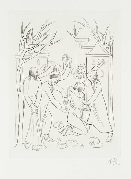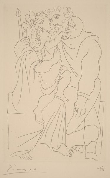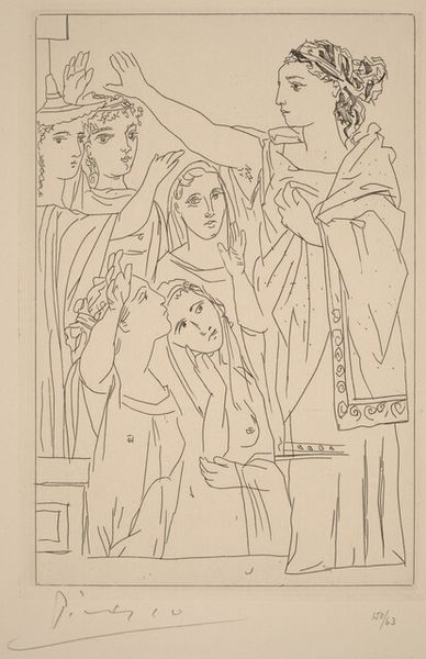 Editor: Right now, we're looking at Picasso's etching "Two Desparate Men on the Seashore" from 1934. It's a stark image – two figures by the water, rendered with these really fragile, wavering lines. It feels lonely and a bit unsettling. What do you see in this piece? Curator: The political climate of 1934 France absolutely permeates this image. Consider the rising tide of fascism. These figures, perhaps refugees, embody a deep sense of precarity. Look at how Picasso uses the etching technique, almost a "pencil sketch" feel, which further underscores this fragility, reflecting the vulnerability of individuals facing political upheaval. Editor: Refugees, that's interesting. I was caught up in the emotions, I didn't consider it in relation to its time. Curator: Exactly. Picasso, consciously or not, tapped into the anxieties of the period. Also, note the stark, classical reference—these figures, drawn with minimal lines, still evoke antiquity, perhaps connecting their despair to timeless human struggles. How do you see the interplay between that classicism and the modern angst? Editor: I think I was too focused on the bleakness to even think about classicism. It's interesting how he's almost using a traditional visual language to portray such a modern emotion, like... anxiety. That adds another layer of complexity, I think. Curator: Absolutely. And that tension, that friction, is precisely where so much of the image’s power lies, reflecting a society struggling to reconcile its past with an uncertain future. Now what do we make of the sailing boat far out on the horizon? Editor: Hmm, escape maybe? Or just another symbol of unattainable hope? This was much more than a simple depressing picture of desperation! I feel like I am better equipped now to guide future visitors through Picasso's art. Curator: Indeed. Understanding the political and cultural context elevates it beyond a mere expression of despair. It's a window into a society teetering on the brink.