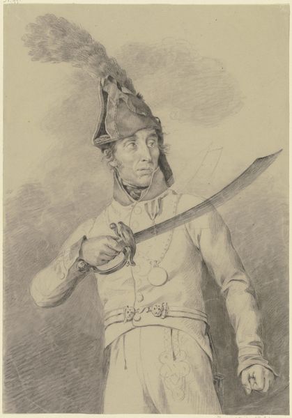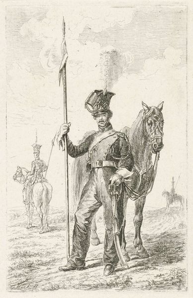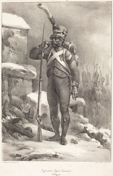 Curator: This engraving by Nicolas Toussaint Charlet, titled "Infanterie légère française, Carabinier", dates back to 1822. It presents a striking depiction of a French light infantryman. Editor: My immediate impression is one of somber intensity. The detail is incredible, capturing every line and fold of the uniform. You can almost feel the weight of the rifle he carries. Curator: Indeed. Charlet was known for his detailed depictions of military figures. The engraving itself speaks to broader themes of militarism in post-Revolutionary France, and the evolving role of the individual within the larger machinery of the state. We should examine how this work resonates within intersectional narratives. What kind of narrative did the French want to impose in Europe? Editor: For me, the key lies in the production of this image. The choice of engraving suggests a desire for reproducibility and dissemination to a wide audience. Engravings such as these, made with ink on paper, would allow a specific kind of memory making and image circulation within France, beyond. Consider the labour and the materials involved. How were these materials produced and by whom? And in what quantities were they created to get the image to travel so efficiently? Curator: Good points. Furthermore, if we analyze the soldier’s dress and equipment in relation to gender studies, we might discover symbolic assertions of power. This artwork helps establish connections to understand the larger context of masculinist state projects and what these portraits sought to perpetuate across the European territories. Editor: Absolutely. The way he's rendered, the focus on the materiality of the uniform, it isn't just about aesthetics; it is about the very manufacturing of the state's military image through the meticulous crafting of an image that emphasizes strength. The image’s power resides in its tangible existence as something both to be observed and widely owned as part of a set or collection. Curator: I hadn’t thought of it in those terms, but that does illuminate some underlying currents that make it a piece so exemplary of the early 19th century. Thank you. Editor: My pleasure. Thinking about it this way gives a much more solid sense of its historic place.
