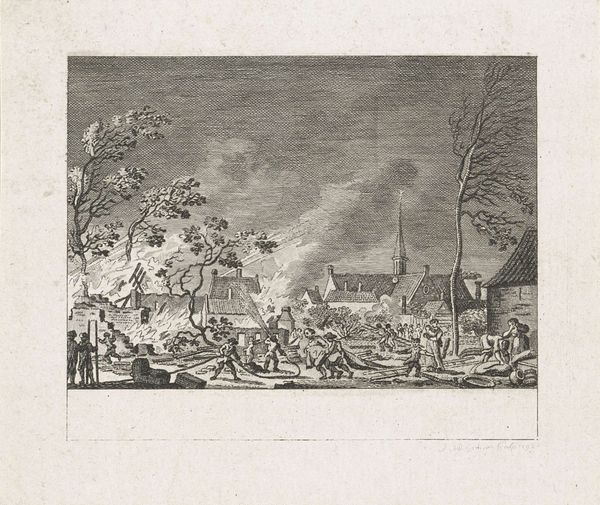 This print by A. Lutz depicts the Nieuwe Lutherse Kerk in Amsterdam consumed by fire in 1822, rendered in detailed monochrome. The artwork is structured around a stark contrast: the chaotic spectacle of the burning church against the orderly rows of onlookers and linear perspective of the canal. The visual organization is a key to understanding the artist’s intent; the inferno is not merely represented but staged. It's framed by the calmness of the canal and the stoic observation of the crowds. This juxtaposition invites us to consider the sublime—the awe and terror induced by natural disasters. The rigid lines of the buildings and the canal edge confront the organic chaos of the fire. The print plays with the semiotic tension between order and disorder, inviting viewers to consider how catastrophic events disrupt social and architectural structures. The dark intensity against the orderly lines prompts questions about our perception of stability and control.