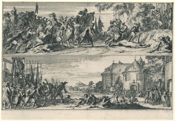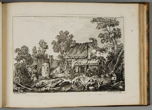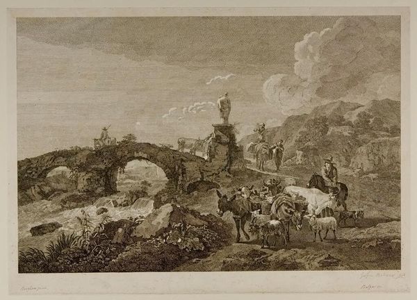 Editor: This is "Horses, Laden, Arriving before a Stone Building," by Johann Balzer. I find the etching style very interesting. What stands out to you? Curator: It's the tension between the idealized scene and the realities of its production. Balzer's labor, the engraver's skill, and the paper itself are all part of the meaning here. How does the act of mass production impact the image of aristocratic life depicted? Editor: That's a great question! I see the print as a way to bring images of the elite to a wider audience, democratizing access, in a way. Curator: Exactly. It's a commodity, a product of its time reflecting social structures and the means of representation. It makes you think about who could afford such things. Editor: True. It shows me how intertwined art and commerce always are.