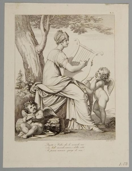 Curator: This is Francesco Bartolozzi's "Pax Artium Nutrix," from around the late 18th century, held in the Harvard Art Museums. It's an etching on paper. I'm drawn to the figure of Peace surrounded by cherubs. Editor: It feels incredibly serene. The composition is quite balanced, almost classical in its arrangement, despite the soft etching technique. Curator: Absolutely. The central female figure, Pax, embodies peace, but she also represents patronage. The cherubs with their book symbolize the arts flourishing under her protection. That severed lion’s head, though—quite striking. Editor: The lion could represent the subjugation of war, allowing the arts to thrive. The interplay of light and shadow enhances the allegorical mood. It feels like a symbolic order is emerging from chaos. Curator: And the inclusion of the laurel-wreathed bust ties into the classical theme, suggesting historical continuity and the timeless importance of peace for cultural achievement. The etching is a testament to the enduring human aspiration for a world where art can flourish. Editor: Looking closely, it's clear that the artist created something visually harmonious, and the effect of all the iconographic symbols and balanced composition has been a calming experience.