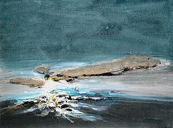 Curator: Here we have "Composition," a mixed-media work, combining watercolor and ink, by Claude Georges. Editor: My first impression is of something unsettled. A landscape perhaps, but turbulent, with those scratching lines giving it an almost anxious quality. Curator: Interesting. The use of line is certainly dynamic. Observe how the artist contrasts the fluidity of the watercolor washes with the sharp, assertive strokes of ink. This juxtaposition creates visual tension. We have the indistinct shapes set against firm contours. Editor: Absolutely, and consider the colour. Predominantly muted tones—grays, blues—with stark gold that pierces through like sudden insight or a buried treasure. It reminds me a little of certain Japanese aesthetics, in terms of their balance and sense of Zen. Curator: The gold introduces a layer of complexity, definitely. It serves not just as colour, but almost as light, illuminating the underlying composition and acting as a visual signifier of value. Look closer: this application almost suggests symbolic gestures—maybe wealth, maybe knowledge. Editor: Yes, the colour provides an anchoring visual theme, especially given its contrast against the grey shades. Perhaps it's too simple to reduce it down to base materials such as wealth and gold, but there may be historical and cultural implications stemming from this. Curator: It’s also important to think of this in terms of Abstract Expressionism; it embodies pure artistic freedom, rejecting traditional representational forms and hierarchies of composition. The absence of a central figure also removes any figurative reading. Editor: The lack of a definite narrative pushes me towards symbolic readings even more. These marks could mirror chaos, yes, or the individual psyche coming to terms with the world, which could have origins steeped deep in Jungian ideas. Curator: Well, viewing it through a psychological lens highlights the subjectivity inherent in abstract art. Ultimately, "Composition," by Claude Georges is a meditation on form and emotion, and the complex relationships they create in the observer's mind. Editor: Indeed. And through exploring form, colour, and, perhaps hidden within those, cultural clues, we've each arrived at what I suspect are merely a couple of readings among many, shaped by what each of us brings when viewing this artwork.