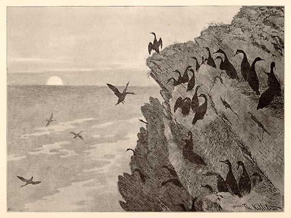 Theodor Severin Kittelsen's ‘Pesta Drar’ is a monochrome drawing featuring a rocky outcrop by the sea. The composition is structured to lead the eye from the foreground’s textured stones to the horizon, setting a stage for its central figure. A cloaked figure sits atop the rocks, their form rendered with heavy shading that obscures details. Above, birds are silhouetted against a pale sky, introducing a dynamic rhythm. The textures play a pivotal role here. The rough, uneven surfaces of the rocks contrast with the smoother depiction of the sky and sea, enriching the visual experience. The dark, almost monolithic form of the figure against the openness of the landscape invites semiotic interpretation. The figure holds objects which function as signs, possibly symbolizing themes of isolation or foreboding. The composition and use of tonal contrasts challenges any singular reading. Instead, it opens a space for ongoing dialogue. The interplay of light and shadow, combined with the textural contrasts, creates a visually compelling field that destabilizes any easy interpretation.