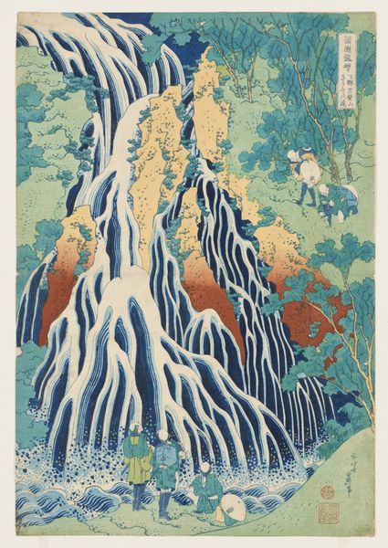 Curator: We are looking at a woodblock print by Katsushika Hokusai, titled "De waterval waar Yoshitsune zijn paard waste te Yoshino in de provincie Yamato." It’s from sometime between 1830 and 1834. Editor: The composition immediately strikes me. The waterfall dominates the scene, but it's stylized, almost ornamental in its cascading form. There's a definite play between the naturalistic setting and the abstract rendering of water. Curator: Indeed. Hokusai's treatment of the waterfall reduces nature to almost pure design. Look closely at the linear quality, the arrangement of the water—it creates a rhythmic pattern across the surface. Consider how the colour blocking and the absence of shading lend the scene to this almost fantastical depiction of a moment in history. Editor: Is this based on historical fact? Who is Yoshitsune, and why is he washing his horse? The print offers a glimpse into Japanese folklore, a reflection of social values around heroism and equestrian nobility perhaps? Curator: Minamoto no Yoshitsune was a prominent military commander of the Minamoto clan during the late Heian and early Kamakura periods. The act of washing his horse here underscores the physical prowess and ritual purification central to his martial identity. Furthermore, it touches upon the role of landscape in legitimizing political figures and narratives. Editor: But Hokusai’s departure from strict realism serves a purpose, doesn't it? The simplification, the intense color contrast—the ochre rocks against the intense blue water—everything contributes to the graphic impact. He’s elevating the historical narrative to the realm of legend through visual vocabulary. Curator: Precisely. Hokusai leverages printmaking to create not a documentary, but a compelling symbol, focusing on the graphic strength inherent within ukiyo-e tradition. The tension between representation and abstraction allows the work to transcend pure illustration. Editor: The print leaves me pondering how art reinterprets historical memory—the event fades, the symbol remains, and how we can use the present to analyze the values assigned to the past. Curator: Absolutely. I, on the other hand, leave contemplating the visual ingenuity with which Hokusai encapsulates the relationship between humans, animals, and landscape—purely on compositional terms.
