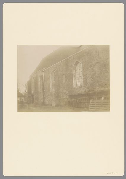 Editor: So, this is "Oostzijde van de grote kerk te Vollenhove," taken in 1898 by an anonymous photographer from Monumentenzorg. It’s quite striking, this photographic print – almost sepia-toned. The composition, with the church angled in the frame, creates a sense of imposing structure and subtle mystery. What do you make of it? Curator: The formal aspects of this photograph immediately draw my attention. Consider the linear qualities: the horizontal lines of the building's base and roofline, punctuated by the verticality of the tower. These elements create a structured visual framework. Observe how the limited tonal range, predominantly in that sepia spectrum you mentioned, impacts the piece. Do you feel it emphasizes the texture of the brickwork or perhaps flattens the overall image? Editor: I think it almost emphasizes the texture. The contrast isn’t super sharp, but you can still see the individual bricks. What I find fascinating is the way the light almost washes out certain areas, almost blurring the edges of the building. Curator: Exactly. Note how the absence of sharp contrasts affects our perception of depth. This near-monochromatic palette limits depth perception, focusing our attention instead on the play of light and shadow across the facade. Editor: So it directs how we see the photograph, playing with those compositional elements rather than trying to capture a realistic representation? Curator: Precisely. The photograph, through its manipulation of light, shadow, and texture, transcends a mere representational function, evolving into an artistic statement in itself. Editor: I never would have thought about it that way. It’s really interesting to think about it not as just a historical record but an intentional aesthetic choice. Curator: Indeed. By analyzing these formal elements, we uncover the artistic intent behind what might initially appear as a simple architectural photograph.