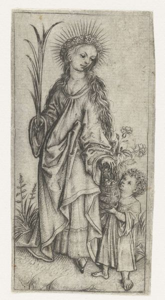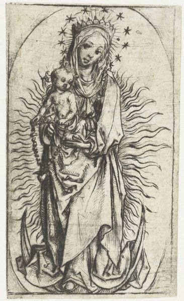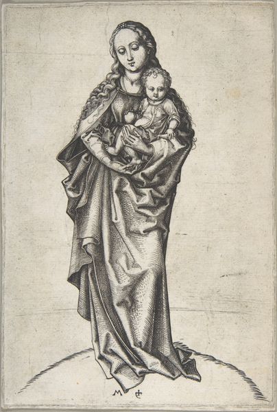 The Master of the Amsterdam Cabinet etched this small plate, "Madonna on the Crescent Moon," likely in the 1480s, using drypoint on metal. The image presents a classic Northern Renaissance interpretation of the Virgin Mary as Queen of Heaven. The Madonna stands serenely on a crescent moon, a halo of stars around her head. Her downcast eyes suggest humility, while the Christ Child gazes outward, a symbol of hope for the faithful. Made in the Netherlands, a region then deeply influenced by religious devotion, this print reflects the era's intense spiritual climate. Art production was often commissioned by religious institutions or wealthy patrons seeking to demonstrate piety. The image would have functioned both as a devotional object, and a status symbol. Understanding this artwork demands that we research the period's religious art market, the specific symbolism of the crescent moon, and the cult of the Virgin Mary. It is through historical context that we can fully appreciate this work.