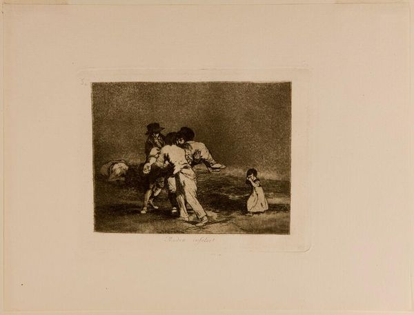 Curator: This is "They Don't Want To" by Francisco José de Goya y Lucientes, part of his series, "The Disasters of War," residing at the Harvard Art Museums. Editor: It’s stark. The rapid etching conveys immediate chaos and tension, like a fleeting moment captured brutally. Curator: Indeed. Note the hunched figure on the right, almost witch-like, brandishing something—perhaps urging the couple to separate. It speaks to societal pressures and failed relationships. Editor: Or perhaps the etching process itself mirrors the social pressures; the acid biting into the metal, mirroring the corrosive forces acting on these figures. The very materiality implies conflict. Curator: An intriguing point. The skeletal architecture in the background evokes a ruined world—a symbol of societal collapse, forcing unnatural unions. Editor: And yet, despite the supposed desperation, there's a strange beauty in the way Goya uses the medium to evoke such raw emotion. Curator: It’s a chilling reminder that art can stem from and depict the darkest corners of human experience. Editor: It makes me consider the socio-economic conditions that allowed Goya to create these images, and how those conditions shaped the narrative.