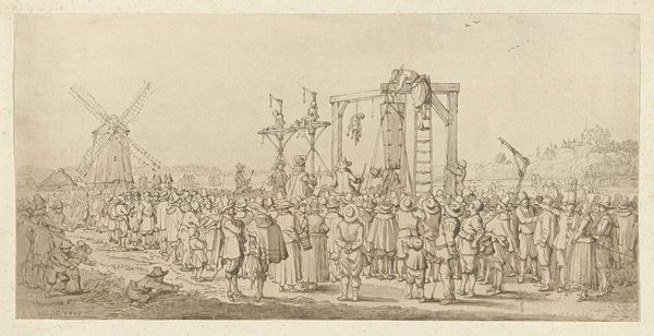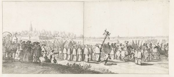 Curator: A fascinating example of 17th-century Dutch printmaking we have here, titled "Uittocht van het Spaanse garnizoen uit Breda (plaat 1)," dating back to 1637. This piece is currently held in the Rijksmuseum. Editor: It's striking, this depiction of what I presume is a defeated army. The mass of figures is so tightly packed, the detail so fine – it feels almost claustrophobic, despite the open landscape. Curator: Precisely. As an engraving, it served an important public function – disseminating images of key political events. In this case, the retreat of the Spanish garrison from Breda after its capture by the Dutch Republic. Note how this image helped create and promote a particular historical narrative within the context of ongoing struggles for sovereignty and religious self-determination. Editor: And you can see it in the details. The posture of those retreating... their lowered flags, the burdened expressions. Symbolically, it resonates as defeat and humiliation. But look closely; it's almost dignified in its depiction, even for the vanquished. Is that intentional? Curator: That's where interpretation gets interesting, isn't it? These prints could serve various agendas. Commemoration, of course, but also nation-building. Perhaps it was aimed to show the power of the Dutch, the justness of their cause, by representing their defeated enemy in this manner rather than as dehumanized victims. It speaks volumes about image politics in the early modern period. Editor: It's a stark scene. But seeing it like this makes me contemplate more than just its historical context, though important that may be. All those figures represented show something universal – displacement, the loss of power, or even just of belonging. They're timeless themes communicated via calculated symbols of visual language. Curator: Yes, indeed. So much weight imbued by that careful balance between propagandistic message and symbolic visual grammar. Ultimately, art historians will delve deeper to understand it with critical perception, including the function of cultural memory represented by these emblems. Editor: It's a small image packed with a mighty tale to tell, made so skillfully using fine tools that continue speaking today.