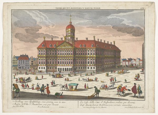 Curator: Here we have "View of the Town Hall and Dam Square in Amsterdam", an engraving from somewhere between 1745 and 1775, by Jean-François Daumont. The Rijksmuseum holds this work, allowing us a glimpse into Amsterdam's past. Editor: Wow, what strikes me first is how airy it feels! There’s this beautiful pale sky taking up nearly half the image, and the figures scattered about the square seem almost like they're floating. A little bit Wes Anderson, maybe, but with more canals? Curator: I'd say your assessment resonates, in particular given what was going on in that time period. Consider Amsterdam's transformation into a major economic and cultural center during the Dutch Golden Age. This piece could offer insights into civic identity, class, and social interactions, providing context to urban development during a crucial era. Editor: Yes, that's interesting when you zoom in on the detail. All the figures are rendered so carefully! Not as individuals, necessarily, but like tiny representations of Dutch society, almost. But it makes me wonder, were cityscapes used as political statements back then? Is it purely representational or did it reflect something else about the society and the state? Curator: Absolutely, such pieces contributed to constructing and disseminating power and social ideologies. Note the Town Hall dominating the scene and reflecting civic authority, wealth, and architectural prowess, aligning with cultural hegemony by illustrating Dutch ascendancy. Moreover, in Jacques Lacan’s symbolic order, such structures and carefully laid-out social scenes subtly normalized behaviors while suppressing the peripheral. Editor: Okay, that's heavy but cool to know! It kind of deflates the breezy Wes Anderson bubble. Although... is that a hint of self-awareness, do you think? Look how ordered, how idealized, the vision is. Do you feel there’s a wink suggesting something beneath the surface, perhaps the underbelly that supported the Dutch golden age, or am I just overthinking this? Curator: While subversion seems unlikely, a work of art like this definitely lends itself to deconstruction in the service of intersectionality. This lens exposes issues that impact certain factions like the working classes who weren’t typically the beneficiaries. In some sense, it might have had to represent that vision to convince people. Editor: So much for my gentle stroll down memory lane. Curator: Memory is powerful! It provides critical perspective through art. Editor: Well, you know, thanks to you, now when I look at it, I'm picturing a lively yet deeply ordered society. Like a painting about a tightly controlled social project, masquerading as a peaceful day at the Dam.