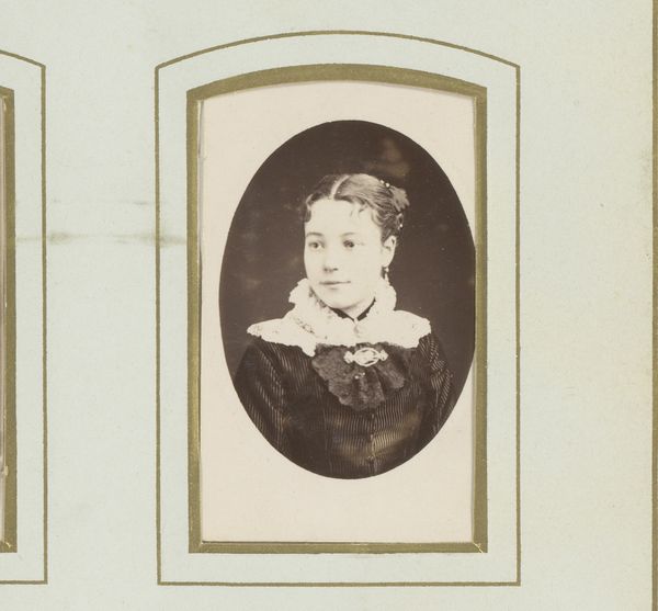 Curator: Let’s discuss this fascinating find: "Portret van een Vrouw," dating from 1850 to 1900, realized through albumen print photography. Editor: The soft focus and subdued palette create a sense of almost ethereal gentility, don’t you think? It reminds me of portraits found tucked away in attics. Curator: Precisely. The formal arrangement—a tightly framed bust portrait—isolates the subject. Note how the tonality subtly shifts to direct our eye, beginning with the detail of her ruffled neckline upward. The composition relies heavily on contrast. Editor: And what of the sitter's pose, her direct gaze? To me, it speaks volumes. There’s a captivating air of modest confidence. Her tightly coiffed hair, framed against the fading print, speaks of a particular societal expectation—yet her eyes convey defiance, don't you think? Almost a quiet rebellion. Curator: It could indicate status and adherence to societal norms, definitely, as the framing of the subject provides more meaning than if there was the image alone. Still, I am compelled by the visual clarity found in the rendering of details versus the broad uniformity. Editor: The symbolism of early photography is intriguing—the frozen moment, the capturing of a likeness for posterity. An attempt to stop time itself, preserving a life. This is why the photo's fading enhances the sense of memory and loss. A constant presence, albeit ghostly. Curator: Very perceptive! These processes involved intense concentration in the act of creation, an artistic effort where material limits are made transparent through intention and skill, don't you think? Editor: It adds a whole new dimension when you approach the study from this point of view. A tangible object that represents layers of intent, memory and also... human frailty. Thanks, this was fun. Curator: The fun was all mine. An incisive interpretation.