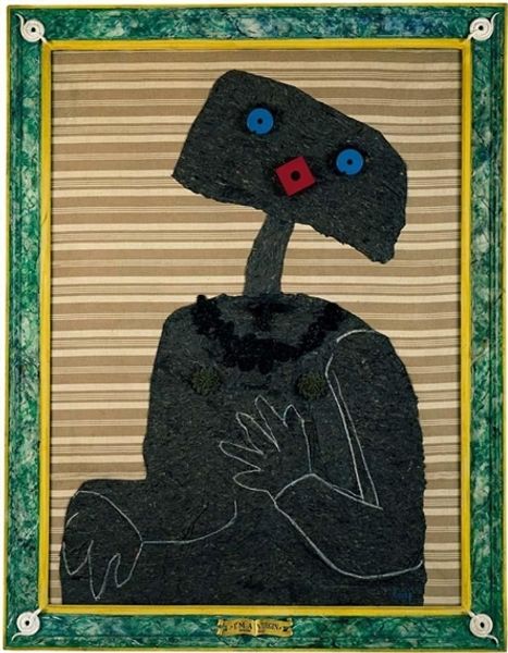 Curator: We're looking at Victor Brauner's "The Boyar," created in 1958 using mixed media, including watercolor and coloured pencil. It is considered a painting as well as a portrait of a historical figure from Romania and other eastern European regions, Art Historian: The first thing that strikes me is how this stylized figure, with its geometric beard, evokes both ancient totems and the graphic sensibility of the mid-20th century. There is an immediacy. It feels like a visual encoding of cultural memory. Curator: Precisely! Brauner, deeply engaged with Surrealism, was consistently interrogating identity, cultural roots, and historical power structures. The very title, "Boyar," speaks to a specific, and often oppressive, social class, making this more than just a simple portrait. The piece invites critical engagement of history. Art Historian: The blue chevron pattern that stands in for the Boyar’s beard gives such a dynamic tension between tradition and abstraction. I wonder about that blue. Its cool detachment juxtaposed with the geometric, somewhat ritualistic composition feels charged. It recalls ancient mosaics. It speaks of regality, perhaps, but of an order now displaced. Curator: And consider that displacement in relation to Brauner himself, a Romanian Jew working within the Parisian Surrealist circles, negotiating his own identity, and reflecting on European history during and after WWII. Is the image meant to evoke pride in tradition, or perhaps signal the downfall of such class-based systems? It is up for debate. Art Historian: Indeed! I see layers of symbolism. That looping form on top of the figure’s head – it hints at ornamentation, at the symbolic weight borne by this historical figure, doesn’t it? It feels deliberately, subtly burdened. The texture itself amplifies this depth, layering colours and techniques into this figure’s face. Curator: It's precisely that tension that makes Brauner so compelling, I believe. Art Historian: He offers us visual history not as a relic but as a reflection on symbolic lineage, and how icons carry emotional and cultural meaning, over time. A very engaging picture indeed.