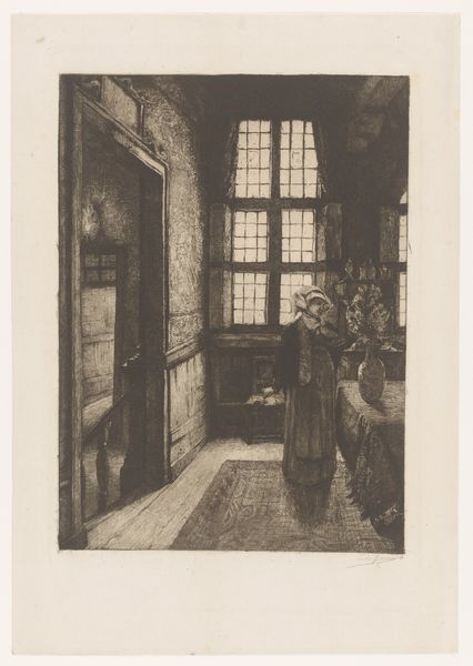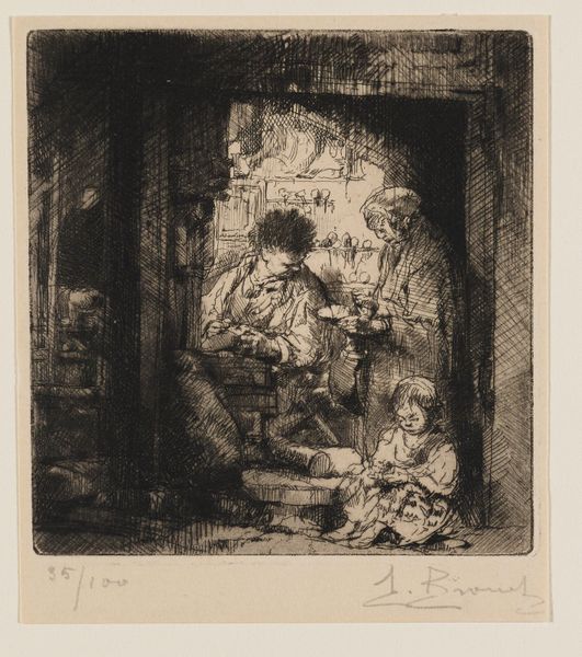 Editor: Here we have H.J. Hammer’s “Modelfamilien i Via Purificazione, Rom” from 1860, an etching on toned paper. The heavy blacks and stark contrast make for an almost claustrophobic mood, and you can almost feel the grit of the city in this piece. What strikes you most about this work? Curator: For me, it's the materiality itself. Consider the labour involved in etching. Each line, each shade is a deliberate act, physically inscribed onto the copper plate. How does that manual process shape our understanding of the family depicted, particularly in the context of Rome’s shifting social fabric in 1860? Were these materials readily available, and how does access shape the images we create? Editor: That’s an interesting point! It almost feels like the deliberate process lends a certain weight and respect to a subject matter that could have been considered common or everyday. Curator: Precisely! Etching, engraving – these weren't merely reproductive technologies but means of elevating certain subjects and perspectives. Also, note how Hammer’s choice to render such stark class differences can be linked to the rise of social consciousness within the art world, fueled by the increased production of readily accessible artworks via printed media. Does this image challenge or reinforce the existing power structures? Editor: I suppose it subtly challenges it by depicting this family and their domesticity in a traditionally valued artistic format, almost giving the everyday scene an important narrative. Curator: It's also worth considering the economic dynamics at play. Was this etching intended for mass consumption, or was it geared toward a wealthier clientele? The mode of distribution, after all, heavily influences how an image impacts a society. Editor: That's true; it definitely complicates the meaning depending on who it reached! Thanks; I’ve never considered approaching a piece from that angle. Curator: Absolutely! By scrutinizing materials and methods of distribution, we understand art not just as aesthetics but as embedded cultural and economic processes.