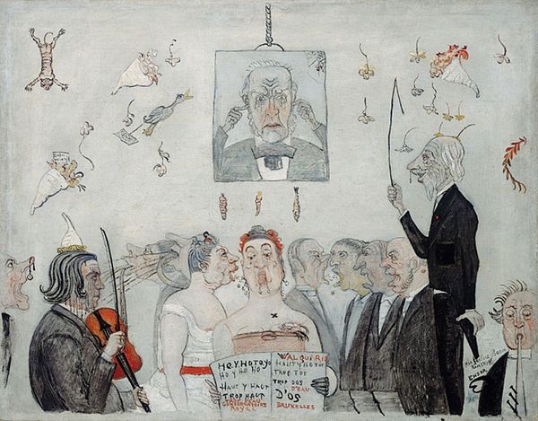 Editor: This is "The Accusation," an oil painting by William Balthazar Rose. I’m struck by how unsettling the whole scene is. There’s a dreamlike quality, but a really disturbing one. How do you interpret this work? Curator: I see a powerful commentary on societal power structures embedded within this surreal landscape. The crucifixion is clearly a central motif, but its placement alongside figures in masks and strange costumes invites us to consider themes of accusation, guilt, and the theatre of justice. Consider how historical injustices are often masked by the performative acts of authority. Editor: Performative acts? Like how? Curator: Well, who gets to decide who is accused, and based on what? Look at the masked figures. The presence of such figures could symbolize the hidden agendas and vested interests driving these accusations. And is it possible the masked figure has anything to do with institutional religion? Do you see how the artist invites us to consider who is really holding the power, and at what cost? Editor: That's fascinating. I was just focused on how bizarre it all looks. I didn't connect the masks to a hidden agenda of justice. It also challenges me to reconsider how those historical elements mirror and challenge contemporary biases. Curator: Precisely. Rose is using familiar symbolism to question the very foundations upon which judgements are made, both then and now. The "Accusation" compels us to unmask our own assumptions and biases, which is always difficult. What would it look like for us to bring these topics more explicitly into public debate about art? Editor: Definitely gives me a lot to think about. Thanks! Curator: My pleasure. And hopefully you’ll leave here thinking that art like this is a powerful tool in shaping conversations around ethics and civic participation!