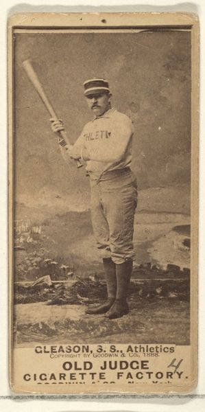 Editor: So, here we have "Sam Barkley, 2nd Base, Pittsburgh," an albumen print from 1887 by Goodwin & Company, plucked from the Old Judge Cigarettes series. What strikes me is how formally posed it is; he's like a statue caught mid-swing. What are your initial thoughts when you examine the visual structure of this print? Curator: The image's success rests significantly on its interplay of light and shadow. Note how the artist employs chiaroscuro to sculpt Barkley's form, lending him a solidity that contrasts with the soft background. Observe too the orthogonals formed by the ground meeting the backdrop – do they resolve neatly, or is there a subtle disjunction that complicates the image's spatial logic? Editor: I hadn't considered the backdrop so closely, I see how it could have conflicting interpretations. What effect is created by framing a commercial item as art, as indicated in the choice to capture an albumen print of an athlete rather than focusing on another typical 19th-century portraiture? Curator: The composition subtly disrupts conventional portraiture. Consider the golden ratio. Is the subject's placement accidental, or is it deliberately calibrated to exploit, or perhaps subvert, classical ideals of proportion and harmony? Ask yourself also whether the subject's gaze engages us directly, or is it averted, lost in contemplation or perhaps mere advertising presentation? Editor: The gaze seems like an aspect that makes the photo feel almost clinical in the sense of how the portrait is positioned to face us with minimal emotional impact. Curator: Precisely. So, in what ways might we decode the semiotics of this sporting icon through rigorous formalism? Editor: Looking at the form devoid of context definitely reveals subtleties within the piece. Thank you! Curator: My pleasure. It’s been beneficial to reconsider this piece outside of any specific social context.