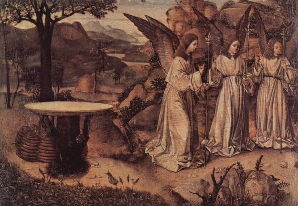 Curator: Welcome to this quiet corner where we find Fra Angelico’s fresco, "Noli Me Tangere," painted around 1442 and still gracing a wall in the Basilica di San Marco, here in Florence. What strikes you about it? Editor: Oh, this is lovely! There's such a peaceful, almost ethereal, quality to it. The colors are soft, and even the figures seem to float a bit. It’s a very gentle encounter. Curator: Exactly. It depicts the moment Christ reveals himself to Mary Magdalene after his resurrection. Notice the garden setting, filled with symbolic elements like the walled garden indicating a sacred and enclosed space. Editor: Yes, and Mary Magdalene reaching out, that "Noli Me Tangere," "Do not touch me," a boundary, perhaps. It is the charged space between disbelief and utter faith. It reminds me how we often want to grasp what eludes us. Curator: That gesture speaks volumes. It's not merely a physical barrier, but an acknowledgment of Christ's transformed state. He is present but also ascending. Consider the symbolic implications of the gardener's guise he initially adopts; he tends to the human soul with careful intention. Editor: Oh, yes, there is so much symbolism here. You know, the cave looks less like a tomb and more like an opening—a portal to another realm. The Italian Renaissance love of pictorial devices! Fra Angelico uses landscape as another means to frame these ideas of ressurection and a 'new creation' motif. Curator: And the gentle, sloping landscape leads the eye upwards, reinforcing that sense of ascension. It really showcases the mastery he had developed by this time in his artistic journey. His blending of devotional intention with formal artistry. Editor: It is rather moving. It speaks to the intimate moments of faith that often defy easy explanations. I always see something different each time I visit this fresco; something I missed or misunderstood from previous viewing. It rewards meditation. Curator: Well said. A divine scene rendered with human grace and sensitivity. It invites us to reflect on our own moments of encountering the sacred and the transformative power of belief. Editor: Ultimately, it shows how, at some level, seeing is believing, and sometimes not believing can show its own kind of love. Thank you!