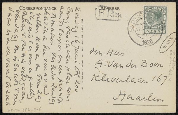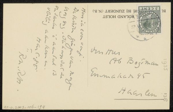This postcard to Ab Bogtman was sent by the Dutch artist Richard Nicolaüs Roland Holst, though we don't know exactly when. It may seem like a slight and insignificant thing, but in reality, the humble postcard is a fascinating artifact of social and institutional history. The Dutch postal system, like others across Europe, played a critical role in expanding literacy and building a sense of national identity. The postal service was crucial for enabling the spread of information, cultural values, and commercial exchange. Holst's message, though personal, speaks to these broader themes. The use of a postcard as a medium reflects how deeply enmeshed the postal service was in everyday life. Art historians often rely on archival research to better understand artworks like this. Personal letters, postal records, and other documents can illuminate the social networks and cultural contexts that shaped artistic production. By examining these sources, we can gain a deeper appreciation for art as a reflection of its time.