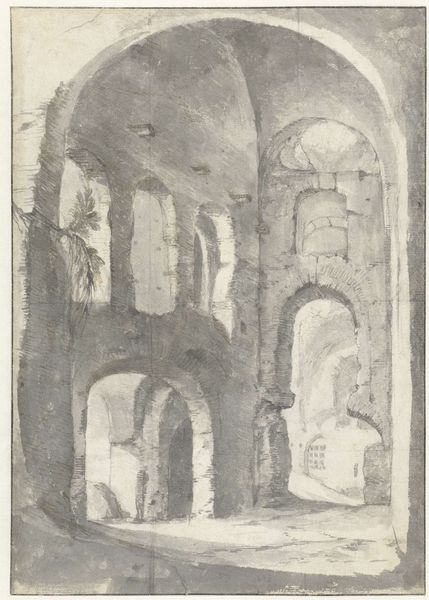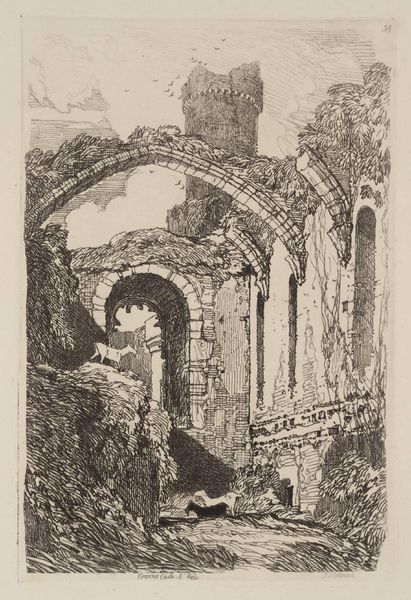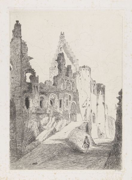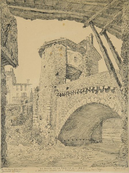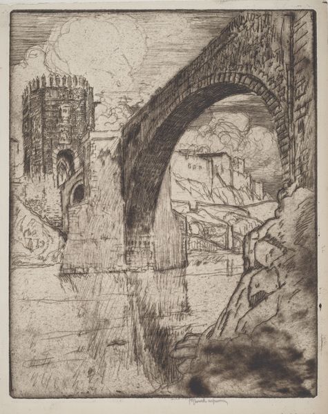 Curator: This is Joseph Pennell's 1904 print, "Bridge of San Juan D'Los Reyos, Toledo," created using ink. Editor: It has this haunting, almost dreamlike quality. It’s so subtle, so much about capturing a mood more than just the physical bridge. Curator: Precisely. Pennell wasn’t just documenting architecture, he was channeling an atmosphere, the weight of history. Notice how the bridge seems to emerge from the landscape? The architecture is barely geometric and somewhat freeform. Editor: The bridge, in that case, isn't merely a crossing, it feels like a symbolic passage through time. I see the arches almost as gateways into different eras, a memory of cultural interaction, don't you think? Like how it’s been viewed under Orientalism? Curator: The suggestion is interesting, that each stone holds a silent narrative! In those very thin, faded lines...there is an almost indescribable echo of something. The technique feels a bit like he's trying to exhume a forgotten moment. The stark contrasts he uses between light and shadow also draw attention to its timeless aspect! Editor: And speaking of echoes, look at the water below the bridge. It’s so still, acting as a mirror, reflecting not just the structure, but also its spirit. It’s not just water, it's a surface capturing centuries of reflections, I bet... a silent witness! Curator: What intrigues me most is that Pennell presents it not as some glorious monument, but something... weather-worn. Human. There's a tenderness there, don't you feel? Editor: Absolutely. I'm feeling this deeply moving respect, or understanding, of the impermanence of everything, ourselves included. It urges you to stop, think, and recognize these silent, cultural, keepers. The mood and atmosphere that this art creates make one almost want to see more to imagine how magnificent the monument was. Curator: Beautifully said!
