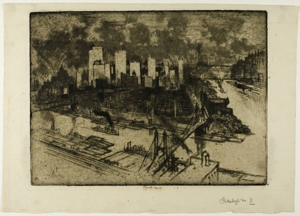 Joseph Pennell made this etching, Pittsburg, No. II, in 1908, and it’s like he's trying to capture a whole world with just a few lines. It’s a real testament to the power of process, how much you can do with the bare minimum. Look at the way Pennell uses line to create this sense of depth. The etching is full of atmosphere and smoke, achieved through these delicate, almost scribbled lines, that give the whole scene a hazy feel. I love how he creates texture. You can almost feel the grit of the city, the rough edges of the buildings, the sooty residue from the factories. The smoke billows, creating this almost abstract shape that contrasts beautifully with the more defined structures below. There’s a sense of energy, of industry, of life happening, all captured in this monochrome palette. It reminds me of Whistler's etchings of London, that same interest in capturing the atmosphere of a city in flux. Ultimately, it's a reminder that art isn't about perfection, it's about the journey.