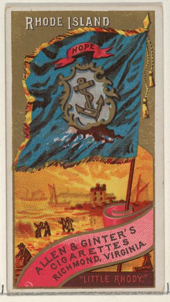 Curator: Well, if that doesn't scream "vintage Americana," I don't know what does. We're looking at "Pennsylvania, from Flags of the States and Territories," part of a series made by Allen & Ginter Cigarettes back in 1888. Quite the find, isn’t it? Editor: It's quaint, definitely a decorative piece, all charming naiveté and bold colors, but that's precisely what feels unsettling. The state flag rendered like this –it's like a hyper-stylized simulacrum, flattening meaning for the sake of design. The lack of depth seems deliberate. Curator: Exactly! And consider this –it’s printed, likely a chromolithograph on paper, and initially distributed as collectible cards in cigarette packs. Suddenly, this “naive art” as some AI programs call it, becomes part of a much bigger game: commerce, consumerism, identity. Ironic, huh? “Virtue, Liberty, and Independence” branded on something linked to nicotine addiction! Editor: Yes, the semiotics are thick, aren't they? The flag itself—eagle, horses, a shield depicting, apparently, ships and wheat sheaves –becomes a signifier divorced from historical context. Stripped, reproduced, then consumed and collected! Allen & Ginter commodify not just tobacco, but Pennsylvania itself. Note how the "Keystone State" slogan is prominently emblazoned at the bottom...it is an ad, no matter how beautiful. Curator: Absolutely! The color palette adds to this—the vibrant blue against the soft pink backdrop, everything perfectly balanced. Allen & Ginter masterfully turned something as mundane as cigarette packaging into miniature works of art, sparking collecting craze in their customer base. Clever lads, though somewhat cynical if you ponder how it all works, wouldn’t you say? Editor: "Cynical" seems apt when viewing from our contemporary vantage. This aestheticisation performs a dual function – enticing consumption through visual pleasure but masking, or perhaps overriding, any deeper understanding of Pennsylvania’s cultural symbolism and heritage, of the heavy ideals it proclaims to uphold on the state flag in the first place! Curator: Ultimately, a tiny little piece like this opens a portal to a vast landscape of issues; from advertising and cultural appropriation to mass production and collective consciousness in a time capsule! Fascinating! Editor: Indeed, these visual contradictions make it much more than a simple historical trinket, and reminds me there are countless layers of coded marketing within the American experiment.