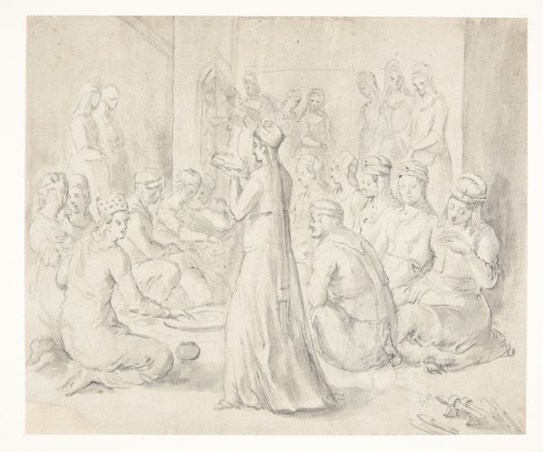 Curator: Upon initial viewing, the composition draws me in, especially with the stark use of the pen to define the scene, making the robes drape so precisely in this 17th-century work. Editor: Absolutely, it's quite a striking composition. This pen drawing by Jürgen Ovens is titled “Figurkomposition omkring en tronende, læsende pave” which translates roughly to “Figural Composition around a Throned, Reading Pope.” It’s currently housed here at the SMK, Statens Museum for Kunst. Curator: The social and historical context of the papacy during the Baroque period immediately springs to mind. The power dynamics, the public displays of piety, and the Church’s role in shaping society must have deeply informed Oven’s depiction. I wonder, how much of this portrayal is meant to convey reverence, and how much might be commentary on papal authority? Editor: Well, observe the spatial relationships. The figures arranged around the pope seem intentionally placed to create visual harmony. Notice how the artist employs similar color saturation among them all? All the figures and background objects share roughly the same hue, suggesting the space or gathering that surrounds this figure is far more important to Oven’s intention than highlighting a sole actor. Curator: That’s an astute observation. The way Ovens renders the crowd certainly emphasizes the community, and the Baroque aesthetic really lends itself to grandiose display, right? Editor: Precisely! It brings the community into focus as a key pillar of support around the figure who reads. Curator: I agree. The medium – a pen drawing with delicate shading – suggests the artist prioritized speed of creation. Perhaps it was a preliminary sketch for a more involved and permanent painting. It must have been an efficient way to record details and layout possibilities, reflecting a society increasingly interested in efficiency and production. Editor: Ultimately, Jürgen Ovens captures a visual snapshot that speaks both to meticulous composition and social dynamics, one that could continue inspiring dialogue for years. Curator: It’s these layers of meaning and technique which solidify my appreciation for art’s impact. Editor: And there’s always so much to decode, wouldn’t you agree?