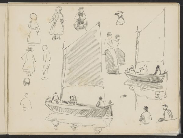 Curator: What a playful piece this is! Here we have Willem Bastiaan Tholen’s “Studieblad met diverse figuurstudies en vissersboten”—that’s Study Sheet with Various Figure Studies and Fishing Boats, from the period 1870 to 1931. Editor: My first impression is one of fleeting observation. The pencil sketches, like snippets of captured moments, feel very intimate—the kind of thing you'd do while soaking up the sun on the beach. What’s fascinating is the raw quality of the pencil on paper. It reminds me of the manual labor that grounds impressionistic paintings, a kind of pre-industrial capture of seaside leisure. Curator: Exactly! It's like he's distilling the essence of a seaside scene. The repetition of the boats—look how they gently shift, morphing across the page. Each one feels slightly different, a fleeting impression rendered in pencil. And those figures! Such simple lines evoke whole characters and narratives. You can almost hear the chatter and feel the salty breeze. It's the everyday elevated to something quite special, wouldn't you say? Editor: I am especially drawn to the labor involved: consider the manufacturing and transport of paper, the production and marketing of pencils, not to mention the construction and labor of those very boats sketched. There is a world of working lives hinted in what appears at first to be innocent observation, or spontaneous impression. Tholen offers not merely a scene but a process of how it is being observed, filtered through pencil and paper. Curator: The material—paper and pencil—gives it a lovely accessible feel. It invites you in, almost as if you could pick up your own pencil and add to the scene. Did Tholen use readily available materials in his drawings in comparison to his oil painting productions? Editor: It feels so much more approachable because it reflects our own abilities, that is to pick up these very tools. The drawing medium makes accessible not just the subject but Tholen's art. As for availability, there’s definitely a question about class. The labor and materials that afford us leisurely observation can, like the sea itself, reflect social strata and means of access. Curator: That's a beautiful observation! Considering the details now, I also notice some boats grounded—waiting to sail again—perhaps suggesting a world in quiet anticipation? Editor: The unfinished sketch quality invites us to reflect not just on observation but production itself, while allowing for interpretations to continue with a sea of change! Curator: This work leaves me feeling grounded yet inspired. It’s a wonderful reminder that the most extraordinary art can often be found in the simplest of moments. Editor: For me it sparks awareness that everyday observations—leisure and labor—can become something to celebrate, and, to dissect materially in our lives.