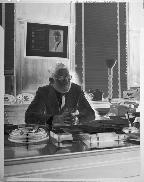 Curator: This photograph, from the Peter James Studio, showcases a man presenting "The New Marketing Map of the United States." It’s a black and white print, roughly 5 by 4 inches. Editor: The high contrast really emphasizes the texture of the map, and the man's gesture is so deliberate. It almost feels like a theatrical performance. Curator: Indeed, the staging is quite intentional. Notice the shelf of bound volumes and the sign on the wall; all elements contributing to an image of authority and the science of marketing. Editor: Absolutely. The visual rhetoric points towards the professionalization of marketing. You know, the map itself promises “The Shortest Route to the National Market”, which is essentially about efficiency and the commodification of geography. Curator: It really highlights how social and economic forces shape what is even considered art. This image has become art through its inclusion in the museum, reflecting a very specific cultural value being placed on commerce. Editor: Precisely. Examining how something like a marketing tool can be reframed in a gallery setting really underscores the malleable nature of what we consider to be meaningful objects.
