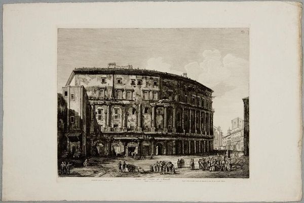 Editor: We’re looking at Giovanni Battista Piranesi's "The Castle of the Acqua Paola on the Golden Mount," a detailed etching that presents a rather grandiose cityscape. I am immediately drawn to how imposing and solid the buildings look in contrast to the people populating the public square in front. What social narratives do you think Piranesi is conveying here? Curator: Piranesi wasn't simply depicting buildings. He was very aware of the power of imagery. This piece, part of his larger *Vedute di Roma* series, served to create a sense of Rome’s grandeur and its historical weight for a rising, tourist-fueled market. Consider the placement of the Acqua Paola itself: its position elevated on the Janiculum Hill literally and figuratively looms large over the everyday life bustling below. What might that elevated perspective suggest about the institution's power? Editor: That's interesting. I guess I initially just saw an architectural rendering, but your perspective helps frame this less as a purely objective depiction and more as a statement on power and spectacle. Do you see any commentary on the institution through the contrast with the figures bustling at street level? Curator: Exactly! Notice how Piranesi meticulously depicts the figures – tourists, laborers, carriages. These aren’t simply background details. Their presence and scale compared to the buildings underscore the power dynamic. While we are invited to admire the castle, are we also subtly made aware of our own comparatively smaller roles within that larger system? Are we meant to marvel or reflect on this disparity? Piranesi certainly intended these images to be consumed by those of certain wealth and influence; do you think it perpetuates the image, or is he making some gesture towards challenging that power dynamic? Editor: I hadn't considered that it could function on those levels. Looking at it again, there is a theatrical element in the positioning of those bustling in the square and how diminutive the scale seems. Curator: Absolutely! Thinking about his work through this historical and cultural lens, we begin to unpack not just what Piranesi shows us, but also why and for whom he was showing it. What an intriguing discussion to better understanding Piranesi. Editor: Thanks. You have given me much to consider beyond the surface details.