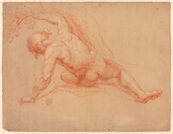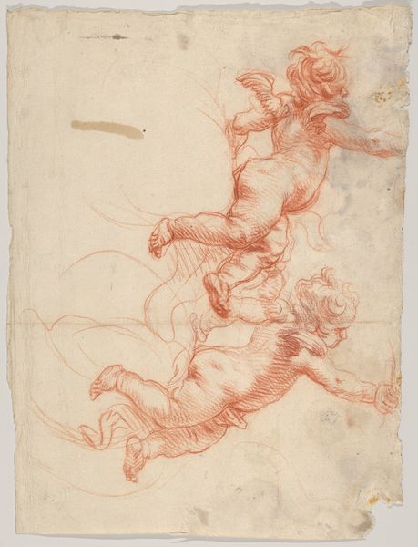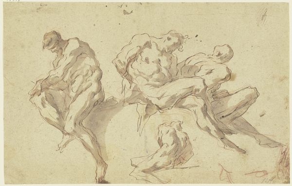 Curator: Immediately, I'm struck by the dynamism in this sheet of studies! The use of line suggests restless energy, and a preoccupation with anatomy and its potentials. Editor: Yes, the sheet is titled "Nude Studies of a Man," and the attribution is to Battista Franco, dating roughly between 1520 and 1561. You know, there is definitely a feeling of anatomical exploration that speaks to the artistic and intellectual climate of the Renaissance, its Humanism and idealisation of man. Curator: Agreed, though I find the variety of poses fascinating from a purely formal perspective. The sanguine figure lunging, juxtaposed with the shadowed, bowed form... there’s a dialogue in the composition itself between action and contemplation, strength and vulnerability. It suggests the Renaissance focus on an almost performative masculinity and control over the body. Editor: I see what you mean. And beyond this aestheticised virility is a palpable humanity. Looking at the studies closer to the grey scale, the backs of the men give the impression of almost raw muscle and sinew. This is the period in which anatomical drawing was emerging, even publicly so! One only has to look at Leonardo's dissections or Vesalius's published anatomical plates. This feels almost voyeuristic! Curator: Absolutely. While some studies show clear refinement, others hint at the quick, observational gesture, a sketch dashed off to capture a fleeting moment of movement. Look at the left corner for example. Editor: As a drawing in red chalk, we see so much tonal richness, from delicate shadows to bold outlines, highlighting the muscular tension and the inherent drama. The artist's concern with perspective and foreshortening really emphasizes how grounded artistic skills were at that time, particularly with all the wealthy Italian commissions coming from the church at this point. Curator: It feels so deeply present and embodies so much the intellectual debates that defined its moment. I appreciate how this piece, at the Rijksmuseum, transcends pure representation, giving the artwork real intellectual texture! Editor: For me, the tension captured here offers a glimpse into a bygone era of both artistic development and humanistic intellectual life; an enduring image worth more than a thousand words.