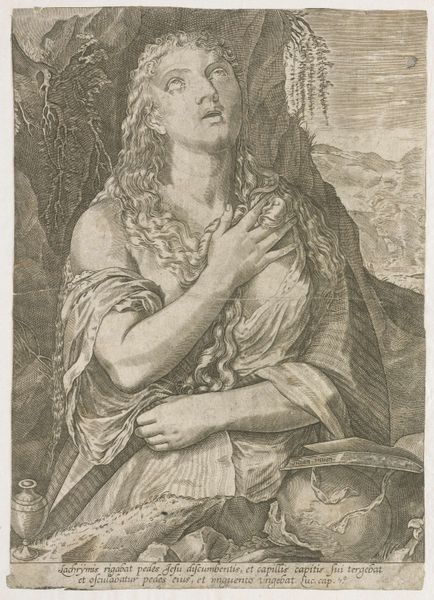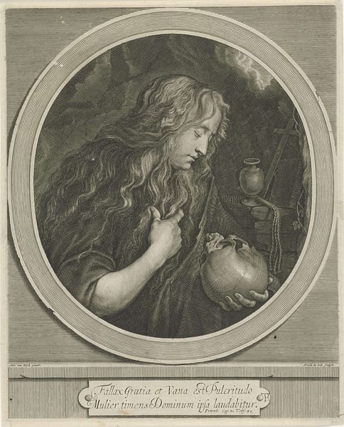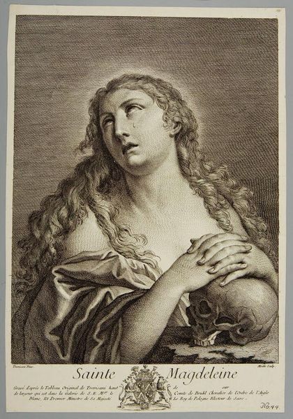 Curator: Here we have Pieter van Schuppen's engraving of Maria Magdalena, estimated to have been created between 1638 and 1655. You can find it here at the Rijksmuseum. Editor: My goodness, there's so much drama in such tight lines. The way she's gazing upwards—it feels like a moment of intense, almost theatrical, surrender. But what’s the story behind this specific depiction? Curator: Van Schuppen was known for his skill at translating paintings into engravings. This piece highlights not only his technical prowess but also prevailing artistic tastes of the Baroque era and of representing powerful religious female figures in print culture. Look at how the medium renders every detail so meticulously, despite its reliance on strong contrasts. It underscores a tension between the beauty and penitence that Mary Magdalene represents. Editor: Yes! It's as if every etched line is both a celebration and a subtle critique. The skull is a blunt reminder of mortality and worldly vanities—fitting for the repentance narrative, but the overt sensuality clashes so intriguingly. A lot of Madonnas are softer in tone than this depiction. It’s the light—streaming down as a divine spotlight almost, adding to that theatrical air—making this figure really stand out in the visual field and perhaps in 17th century popular imagination as well. Curator: Exactly! That contrast made the image popular because it speaks volumes about how visual depictions shaped public understanding and the politics surrounding the depiction of saints. In this particular interpretation, she is stripped bare before divine judgment. Her gesture towards the skull reveals, literally, her acceptance of eventual death while she continues looking hopefully upwards toward redemption. It is Baroque painting translated into an engraving to sell this complicated moment and perspective to mass audiences, allowing many different private devotional understandings of Saint Mary Magdalene's transformation and commitment to spiritual redemption. Editor: Thinking about this engraving now, after our little exploration... it makes me feel how much we bring of ourselves, of our present day and time to the works and its own time! A collision. An eternal conversation.