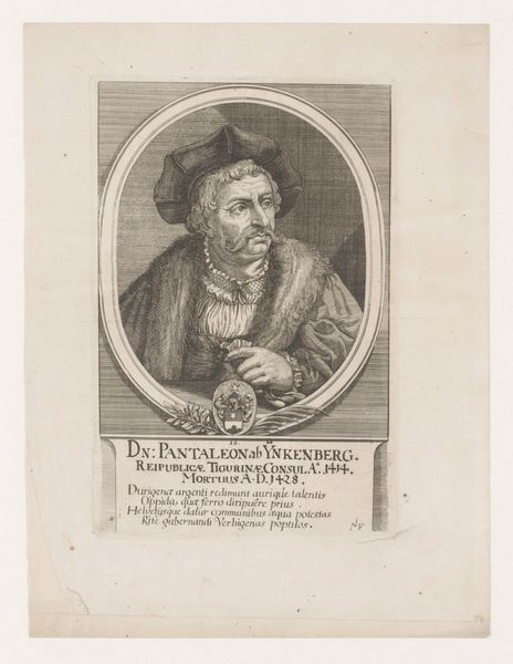 Editor: Here we have a printed portrait of Heinrich Göldlin, dating somewhere between 1665 and 1712, made by Johannes Meyer. It's fascinating how much detail they were able to get from an engraving. What can you tell us about this piece? Curator: Well, putting this portrait in context, we need to consider the rising merchant class in Europe at the time. Engravings like these became popular because they provided a relatively affordable way to disseminate images of prominent individuals, essentially functioning as a form of public relations. The inscription below gives a strong sense of what aspects of Göldlin's identity he and the artist felt needed emphasizing. Notice how much importance is given to his holding civic roles in Tioir. How does that emphasis strike you? Editor: I see what you mean! The prominence of those titles suggests a focus on his public life and contributions. So, these portraits weren’t just about likeness but about conveying a certain societal standing? Curator: Exactly. Think about the visual language used. The oval frame, the ornate coat of arms, even his clothing; they all contribute to a carefully constructed image designed to project power and status. Portraits like these played a role in shaping historical memory and solidifying social hierarchies. What impact do you think these portraits might have on the viewer, then or now? Editor: I guess back then, it would reinforce existing social structures. Today, it offers us insight into the values and aspirations of a different era. It's a good reminder that images always carry a message, even in the details. Curator: Precisely. It demonstrates the vital relationship between artistic creation, social structures and political history, and it gives us insight into how portraits like this perform vital functions within those structures.