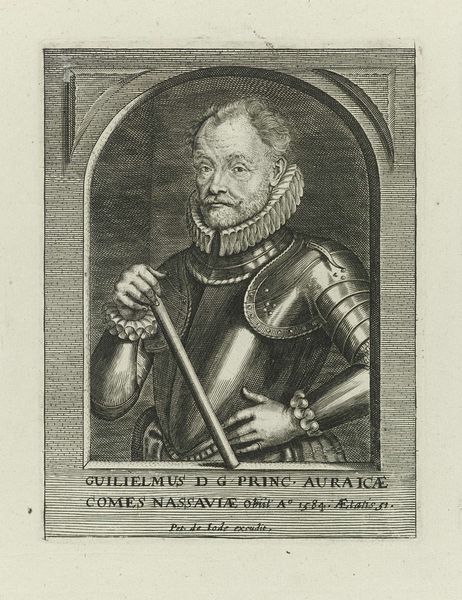 Editor: This is a portrait of Jacob van Heemskerck, an engraving dating from between 1659 and 1713. The level of detail, especially in the armor, is really striking, but the overall effect is almost like a caricature. What do you see in this piece, from an art history perspective? Curator: Looking purely at form, observe the use of line and texture. The artist utilizes varied densities of cross-hatching to create depth and shadow, especially evident in the articulation of the armor. Note how the ruff around the subject’s neck serves as a focal point, contrasting with the rigid, geometric forms of the surrounding metal. Editor: So, it's almost like the softness of the ruff is intended to humanize the subject, playing against the rigid formality of his armor? Curator: Precisely. Consider, also, the composition. The subject's gaze meets the viewer's, establishing direct engagement, while the inclusion of ships on the distant ocean grounds the figure in his professional role as an admiral. The varying weights of line quality direct our attention throughout the work. Do you perceive any points where the engraving's execution is less resolved, perhaps indicating areas of focus or less focus for the artist? Editor: Now that you mention it, the helmet and halberd on the left appear less sharply defined than Heemskerck’s face and armor. Curator: An astute observation. Perhaps to de-emphasize aspects subordinate to the Admiral’s portrait. It’s an elegant way of prioritizing pictorial space. Editor: I see. I hadn't considered how much the strategic use of line contributes to the narrative and hierarchy of the composition. Curator: Indeed. Paying attention to the construction, the deployment of technical means and visual elements provides entry into understanding the artwork as a whole.