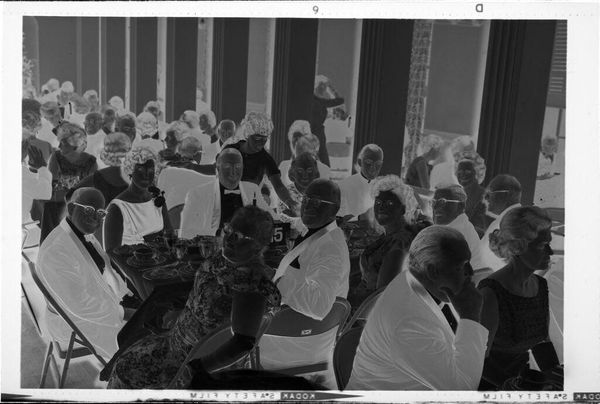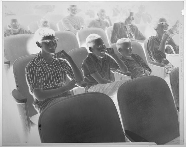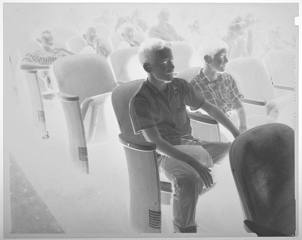 Curator: Jack Gould's untitled photograph captures an audience in a theater, dating from an unknown year and held at the Harvard Art Museums. Editor: The inverted tones give it an eerie, dreamlike quality; the composition focuses on a boy in the foreground, drawing my eye immediately. Curator: Indeed, the stark contrast emphasizes the boy's striped shirt, creating a visual rhythm that repeats across the composition. Editor: The image speaks to the communal experience of entertainment, but also hints at the individual emotions and hidden stories within the crowd, captured by the boy's curious, yet shadowed, gaze. Curator: Considering the reversal of tones, one might perceive it as a metaphor for hidden meanings within our shared visual culture. Editor: The photograph's timeless quality lies in its ability to evoke multiple layers of interpretation simultaneously. Curator: It is a unique view that offers a new perspective for re-examining familiar visual archetypes.