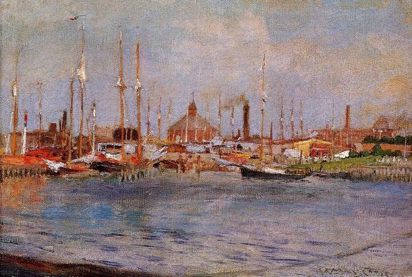 Curator: This is Maxime Maufra's "The Port of Havre," painted in 1905. Editor: There’s an undeniable melancholy hanging in the air. The somber hues of blues and greys really drive that feeling home. Curator: Maufra uses loose brushstrokes, characteristic of post-impressionism. Notice how the texture of the oil paint itself almost mimics the choppy surface of the water. Editor: Absolutely. And the boats, those vessels of trade and travel... historically, the harbor is a locus of hope and anxiety – departure and return. The image feels caught between those emotions. The smokestacks seem to be exhaling that anxiety, literally polluting the sky with it. Curator: That's astute. Maufra's treatment of light and color here really emphasizes atmosphere over detail. See how the buildings on the left dissolve into an almost indistinct mass? He captures a fleeting moment, not a static scene. The masts of the sailing boats also form an interesting network of vertical lines and shapes across the painting. Editor: Yes, and those vertical elements are repeated in the plumes of smoke from the ships, and the rigid lamp post punctuating the right side, creating an interplay between natural and man-made emblems. The ship motif carries a strong symbolic weight; the water becomes a psychological mirror reflecting our inner turmoil, doesn’t it? Curator: One might also view it as an assertion of modernity; industry, trade, and technology all coexisting within this single frame. Look at the juxtaposition between sail and steam! Editor: But steam also points to a certain loss. That the natural power of sail has diminished or been subsumed, if you will. Curator: A fascinating push and pull, wouldn’t you agree? A painting capturing the transition and anxieties of the modern age. Editor: Indeed. There is a story unfolding just beyond what the eye can see. Curator: Thank you for illuminating it so eloquently.
