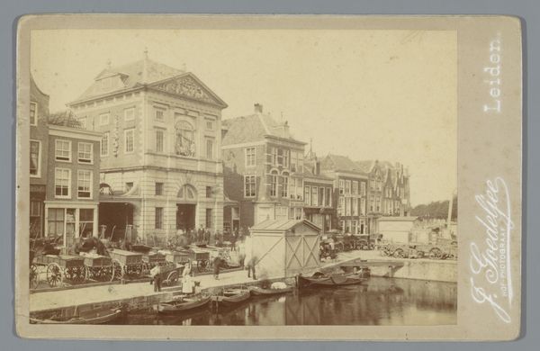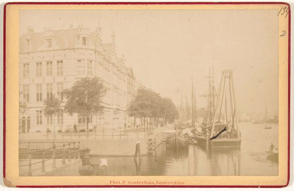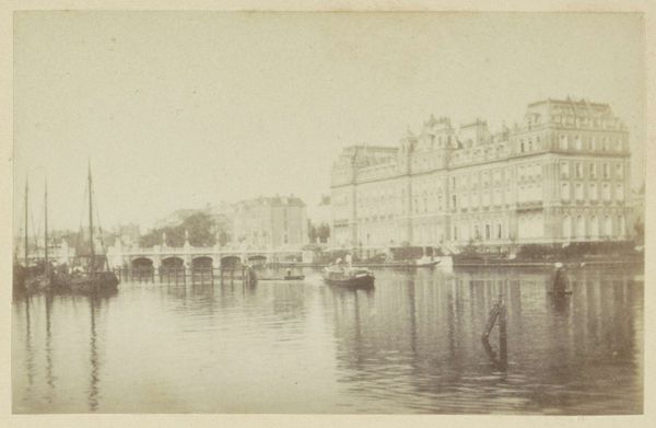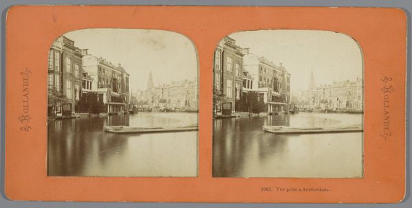 This is an anonymous photograph of the Paleis van Justitie on the Prinsengracht in Amsterdam. The composition is structured along the horizontal lines of the canal and the imposing architecture, which creates a sense of depth and order. The photograph is rendered in a monochromatic palette, which strips away color to emphasize form and texture. This lack of color encourages the viewer to focus on the interplay of light and shadow, revealing the detailed surfaces of the buildings and the water. The perspective, captured through the lens, invites an exploration of space and depth that draws the eye along the canal. What does this formal arrangement communicate? There's a clear articulation of space, but also a sense of detachment, perhaps reflecting the cool, impartial nature of the judicial system the building houses. This is not just a depiction of a place; it's an exploration of how architectural space can influence our perception and understanding.