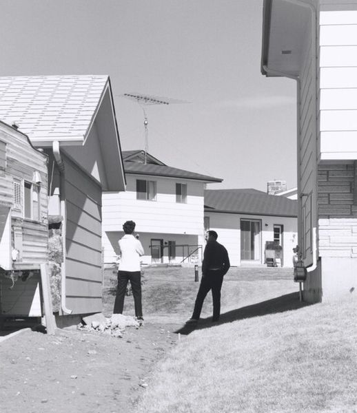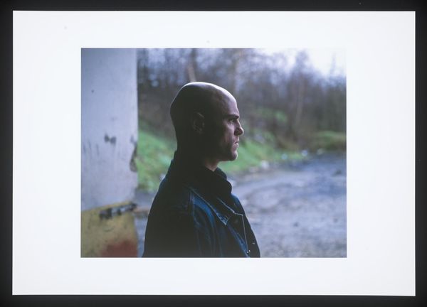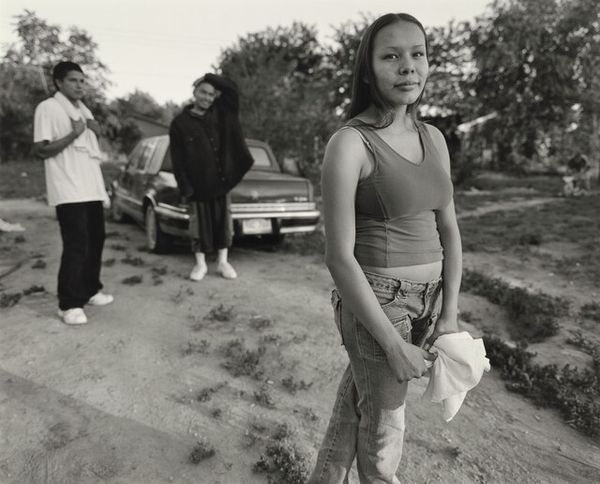 Editor: So, this is Dylan Vitone's "dog walk," a black and white photograph. There's something stark about it, almost confrontational in its mundanity. What's your read on this, what stands out to you? Curator: It's the in-between spaces that sing to me, you know? The awkward pause between the posed and the candid. The dog is the only authentic thing, oblivious. How about you? Do you think the space is as important as the figures? Editor: I hadn't thought of it that way, but I see what you mean. The emptiness around them creates a sense of isolation. It makes the portrait so much more powerful. Curator: Exactly! It’s a symphony of silences, a quiet commentary on connection, or perhaps the lack thereof. It really makes you wonder what the artist was thinking, doesn't it?