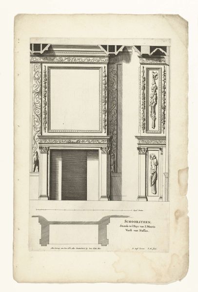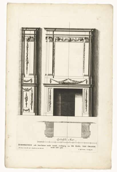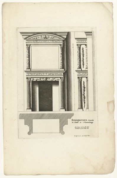 Editor: Here we have Jan Matthysz's "Onderboezem in Paleis Noordeinde" from 1664, created as an engraving. I'm struck by how much detail is captured simply through lines. What stands out to you when you look at it? Curator: Immediately, I'm drawn to consider the social and economic conditions that would lead to commissioning an engraving like this of a fireplace. What kind of labor went into extracting the materials, transporting them, and crafting the original fireplace? The print becomes a secondary artifact reflecting that whole chain. Editor: That’s an interesting point! I was focused on it being architectural and decorative, I had not thought about that kind of raw exploitation of material. Curator: Exactly. Look at the precision. Engravings like this required skilled artisans, drawing techniques. It wasn't just about depicting a fireplace, but also about demonstrating mastery of a craft, an investment by someone. It represents consumption habits of the elite during that period. Can you imagine what social structures were needed to even create the means to finance an engraver making work such as this? Editor: Right, this wasn't mass-produced imagery. I wonder what role it served. Was it for an architect’s portfolio, to showcase designs? Or maybe for a wealthy client’s collection? Curator: Likely, it circulated within a specific network - architects, craftsmen, and patrons - each holding different values towards production and the meaning of displaying wealth. It's a useful primary source reflecting both technological capability and socio-economic disparities. Editor: Thinking about it that way, it does reveal layers I hadn't initially considered, and prompts me to consider who benefitted from creating such a fancy fireplace to begin with. Curator: Precisely, analyzing the print becomes about questioning what social practices and hierarchies are solidified with these prints.