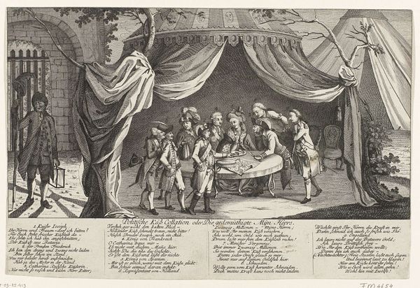 Editor: This is "Vow of the Pheasant (Philip the Good and Isabella at the Feast of the Pheasant in Lille in 1454)", an oil painting from around the 16th century currently held at the Rijksmuseum. I'm really struck by the amount of detail and the stiff formality of the figures. What draws your eye in this piece? Curator: What's fascinating here is considering this image as a record of material culture and social performance. Look closely at the clothing: the textiles, the tailoring. These aren't just depictions; they are signifiers of status painstakingly created through specialized labor. How does examining the physical process of creating and wearing these garments reshape your understanding of power in this court? Editor: That's interesting; I was just thinking about how detached the figures appear. They seem posed, almost like mannequins displaying the fashion of the time. Curator: Precisely! Now, think about the pigment used to create this image. Where would these specific colors have come from? How would they be sourced and prepared? It is crucial to unpack how these things speak to global trade routes and artistic production methods in the late Medieval or Early Renaissance period. Editor: So, even the materials used in the paint itself have a story to tell about the world at that time? Curator: Absolutely. And beyond pigments, consider the panel itself. What kind of wood is it? Where did it come from? How was it prepared? Each decision, each material component, reveals a complex web of resources, labor, and social context. By focusing on the physical reality of the object, we gain a richer appreciation for the historical forces at play. Editor: I never thought about a painting revealing so much about its own creation. It’s made me look at it with a whole new level of interest. Curator: Indeed, the 'Vow of the Pheasant' becomes less a window into a historical event, and more a tapestry woven from the threads of material existence.