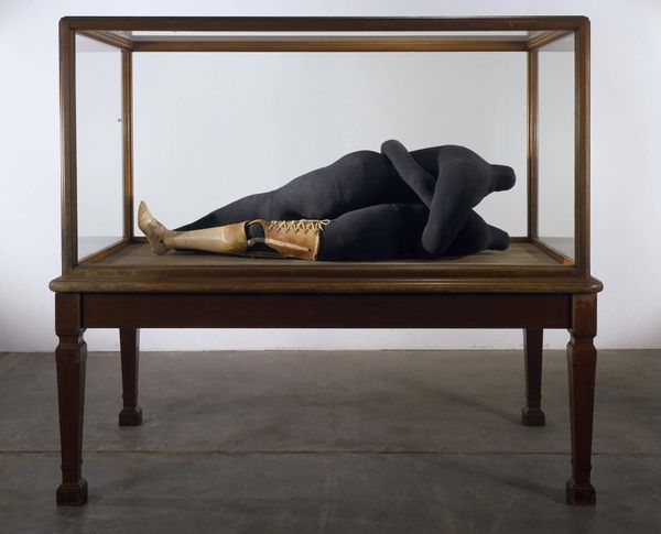 Curator: Oh, this piece always gets a reaction. We're looking at Yinka Shonibare's "HEADLESS MAN TRYING TO DRINK" from 2005, a mixed-media sculpture. Editor: It's… unsettling. Immediately, the headless figure evokes a sense of disorientation. The bright, almost clashing fabrics, the formal attire paired with that blatant absence... it makes me deeply uneasy. What's the story with the fabrics, though? They seem quite particular. Curator: Ah, the fabric is Dutch wax print, or African wax print. Shonibare often uses it to explore post-colonial identity and the complex relationship between Africa and Europe. Ironically, these fabrics, though associated with Africa, have strong ties to European manufacturing. Editor: So, even the material itself speaks to global trade and cultural exchange. Look closer; that impeccable suit and those stylish little buckled shoes suggest wealth. How do those details connect to this visual tension between abundance and absence? It is as if the materiality whispers forgotten truths about labor, the movement of goods, and the relentless churn of consumerism that perpetuates such divisions. Curator: Precisely! Shonibare highlights how identity is constructed through these layers of cultural and economic exchange. The missing head could symbolize a loss of identity, perhaps the lingering effects of colonialism, or even the facelessness of power. But maybe it's simpler than that, just the struggle to quench one’s thirst when everything is designed to exclude certain bodies and experiences. It feels darkly humorous. Editor: It's clever, this intersection between the whimsical and the deeply serious. That cast-iron fountain... there's a utilitarian quality to it that brings to mind civic architecture, of accessibility. But in the absence of a head to take a sip... How can access to resources exist so visibly yet be impossible to utilize? The shiny, uniform painting of that piece feels intentional too, industrial. Curator: Well, art speaks in layers, doesn't it? Editor: Indeed. Shonibare leaves us wrestling with questions about who benefits from systems and the visible presence of structural absence, and what gets left behind in the pursuit of progress. Curator: I keep seeing the sheer visual wit –the headless figure comically bent, seemingly missing the obvious way to get what he wants – alongside that discomfort, even anger. Editor: And I am struck by the ways that such accessibility is, or isn’t, provided. Makes you thirsty for something more tangible than water, eh?