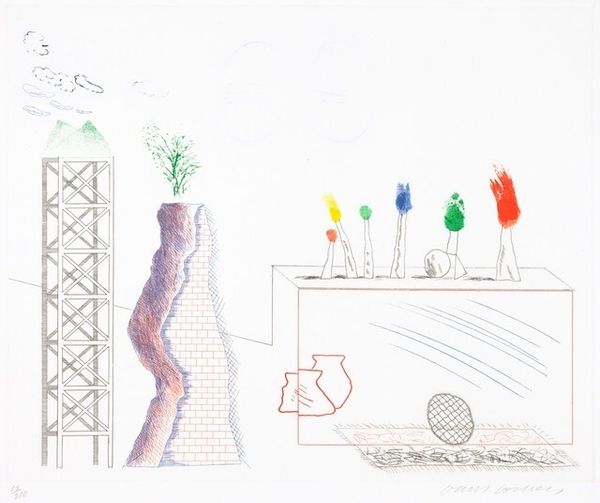This is David Hockney’s ‘On it May Stay His Eye’, a print, and you can see how the image is built up from individual lines, like a drawing, letting the flat whiteness of the page breathe through. There's something so simple about the way he renders this scene, a kind of playful shorthand. Look at the guitar, just a few lines, but we know exactly what it is. And the rug, a dense network of red and blue strokes, almost vibrating with energy. The colours are so sparse, just a few dashes here and there, but they do so much work. It’s so pared back, so direct. It reminds me a little of Matisse, that same joyful simplification of form, that willingness to let a line be a line, and a colour be a colour, without getting bogged down in details. Both artists had a real confidence in the power of suggestion, in letting the viewer fill in the gaps.