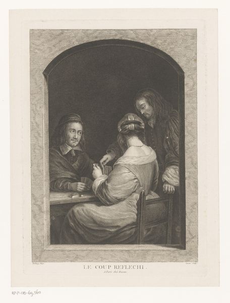 Jacques Dassonville created this small etching in the 17th century, using a metal plate and acid to bring forth an image of three figures in a humble interior. The linear quality of the etching emphasizes the figures' coarse clothing and weathered features. Consider the labor involved in producing an etching like this. Dassonville would have started by meticulously coating a metal plate with a waxy ground. Using a sharp needle, he would then scratch away the ground, exposing the metal beneath. The plate was then submerged in acid, which bit into the exposed lines, creating grooves. The resulting image, when inked and printed, reflects not only Dassonville's artistic skill, but also the physical labor involved in the etching process itself. These lines, seemingly so simple, are a testament to the artist’s craft, reminding us that even in fine art, the hand of the maker is always present. This work offers a glimpse into the everyday lives of ordinary people.