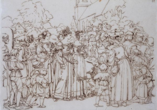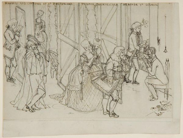 Editor: So, here we have Bernard Picart’s “Groep staande personen,” created sometime between 1683 and 1733, using pen and ink. It’s currently housed here at the Rijksmuseum. It’s fascinating – like a snapshot of everyday life, but also quite formal in its arrangement. What's your take on it? Curator: It's tempting to read this piece through a lens of social hierarchy. Notice the distinct groupings – almost like unspoken tiers of visibility within the crowd. Consider who is given prominence, whose gaze meets ours, and whose is averted or obscured. Who had the power to be seen, and how does that reflect broader societal structures of the time? Editor: That's a great point about visibility and power. The clothing is so detailed and different across the various people in the group, and some are looking out and others are not... Almost like a performance is underway! Curator: Exactly! Think about the performance of gender, class, and status being enacted in this public space. What do their garments and postures communicate about their social standing and individual agency? Consider how artistic representations often legitimized or challenged these existing power dynamics. What's being said about these peoples's agency or autonomy? Editor: That definitely reframes my perspective. It makes me think about how seemingly simple scenes can be loaded with complex messages about social norms and expectations. Are we looking at individual representation or are these just stand-ins? Curator: It's a powerful reminder that art is never created in a vacuum; it is both a product of its time and a commentary upon it. Editor: Absolutely. I'll never see genre scenes the same way again. Thanks so much! Curator: And thank you! It is an absolute joy and vital to explore all these viewpoints and opinions on the art world we inhabit!