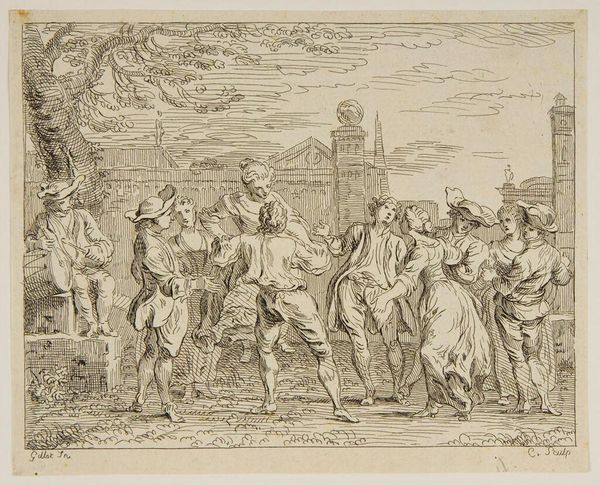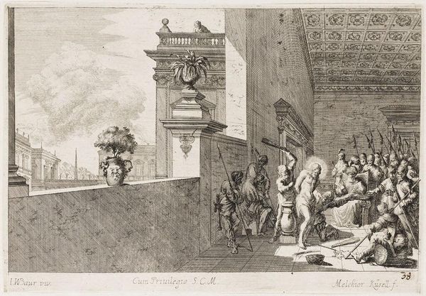 Curator: Washington Allston’s "Study for 'Jason Returning to Demand His Father's Kingdom'" presents us with a pivotal moment from classical mythology. Editor: It feels rather somber, doesn’t it? The monochromatic palette and the crowded composition create a sense of foreboding, despite the grandeur of the setting. Curator: Indeed. Allston, deeply influenced by European masters and the neoclassical revival, aimed to evoke emotional intensity through carefully structured compositions. The return of Jason in the context of American history and the rise of democracy is also noteworthy. Editor: Structurally, the grouping of figures really holds the eye. The dynamism present in the composition leads to a focal point around the seated figure, which then draws our eye to the towering classical architecture in the background. Curator: His use of light and shadow, even in this study, emphasizes the psychological drama. Allston sought to create a “poetry of form,” blending visual harmony with narrative depth. Editor: Absolutely, and Allston’s exploration of line and form here really underscores the power dynamics at play. Curator: A powerful meditation on justice and destiny. Editor: One that resonates with artistic mastery and thought-provoking composition.
